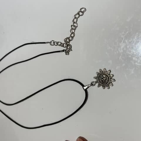 Um colar com um cordão fino na cor preta com um pingente de sol